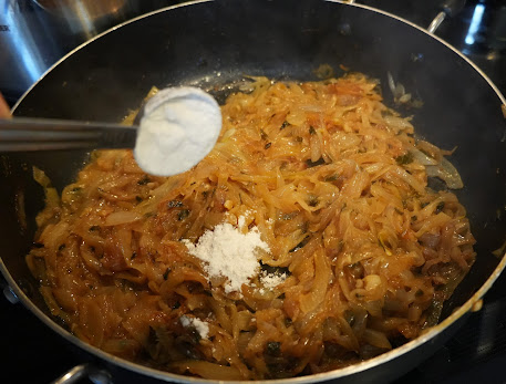 6. When the onion turns brown, lower the heat and add the 1 Tbsp flour and stir well for 1 minute.